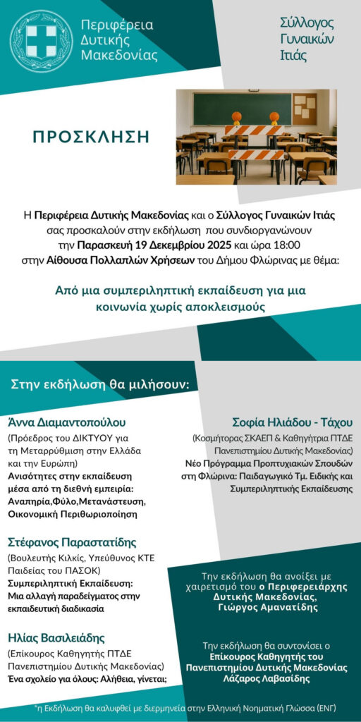 Η Περιφέρεια Δυτικής Μακεδονίας και ο Σύλλογος Γυναικών Ιτιάς συνδιοργανώνουν την Παρασκευή 19 Δεκεμβρίου 2025 και ώρα 18:00 την εκδήλωση στην Αίθουσα Πολλαπλών Χρήσεων του Δήμου Φλώρινας με θέμα: