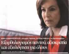Τη διαβεβαίωση ότι ούτε μια μέρα προϋπηρεσίας δεν θα χαθεί για τους αναπληρωτές και ωρομίσθιους εκπαιδευτικούς, στο πλαίσιο των αλλαγών που προωθούνται μέσω του πολυνομοσχεδίου στο σύστημα προσλήψεων και υπηρεσιακών μεταβολών των δασκάλων και των καθηγητών, δίνει η υπουργός Παιδείας Άννα Διαμαντοπούλου. Τονίζει ότι στόχος του υπουργείου είναι «εξορθολογισμός παντού, αξιοκρατία και αξιολόγηση για όλους». Ταυτόχρονα, προαναγγέλλει άνοιγμα διαλόγου για την τριτοβάθμια εκπαίδευση στη χώρα, ενώ αναφορικά με τις εξελίξεις στην ελληνική οικονομία, εκφράζει την αισιοδοξία της ότι η χώρα και οι πολίτες θα ξεπεράσουν το σκόπελο, αφήνοντας παράλληλα αιχμές για την στάση της αντιπολίτευσης στην παρούσα συγκυρία.