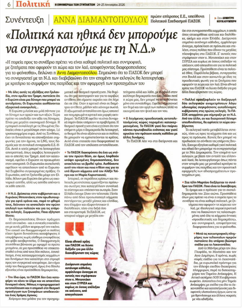 Η Ευρώπη μιλούσε και μιλά πάντοτε για τη δύναμη των αρχών και των αξιών. Τώρα πρέπει να αποδείξει την αξία της δύναμης. Είναι μια μεγάλη οικονομική δύναμη. Η εμπορική συναλλαγή με τις Ηνωμένες Πολιτείες είναι η μεγαλύτερη στον κόσμο, 1,6 τρισεκατομμύρια ευρώ. Από τις Συνθήκες έχει τη δυνατότητα να επανεξετάσει συμφωνίες για την άμυνα, το LNG, τους δασμούς και τη συνολική συνεργασία ΕΕ–ΗΠΑ. Αυτή η ισχύς μπορεί να λειτουργήσει αποτρεπτικά, όπως ακριβώς λειτουργούν και οι απειλές του Τράμπ. Από τον κατευνασμό οφείλει η Ευρώπη να προχωρήσει στην αποτροπή.. Οι Ευρωπαίοι σοσιαλιστές οφείλουν να απαιτήσουν από το Ευρωπαϊκό Συμβούλιο συγκεκριμένες πράξεις. Οι Ευρωπαίοι, από τη Γροιλανδία μέχρι την Ελλάδα, θέλουν μια Ευρώπη όχι μόνο ως οικονομική ασπίδα, αλλά ως ασπίδα απέναντι σε κάθε απειλή